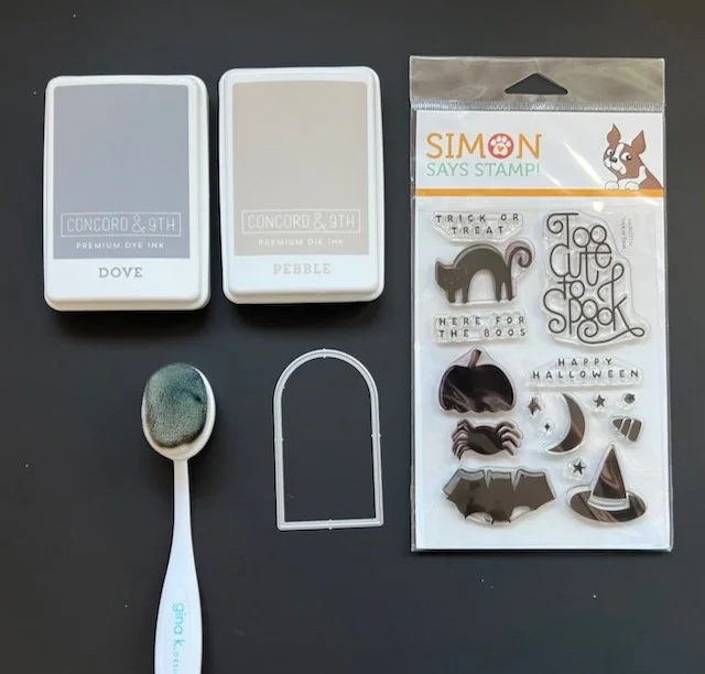 For the little tombstones, I stamped images and greetings onto some light gray cardstock in two colors (slightly offset to give the illusion of dimension). I cut those out using an arch die to create little tombstone shapes. A little bit of ink blending around the edge adds to that illusion of dimension.