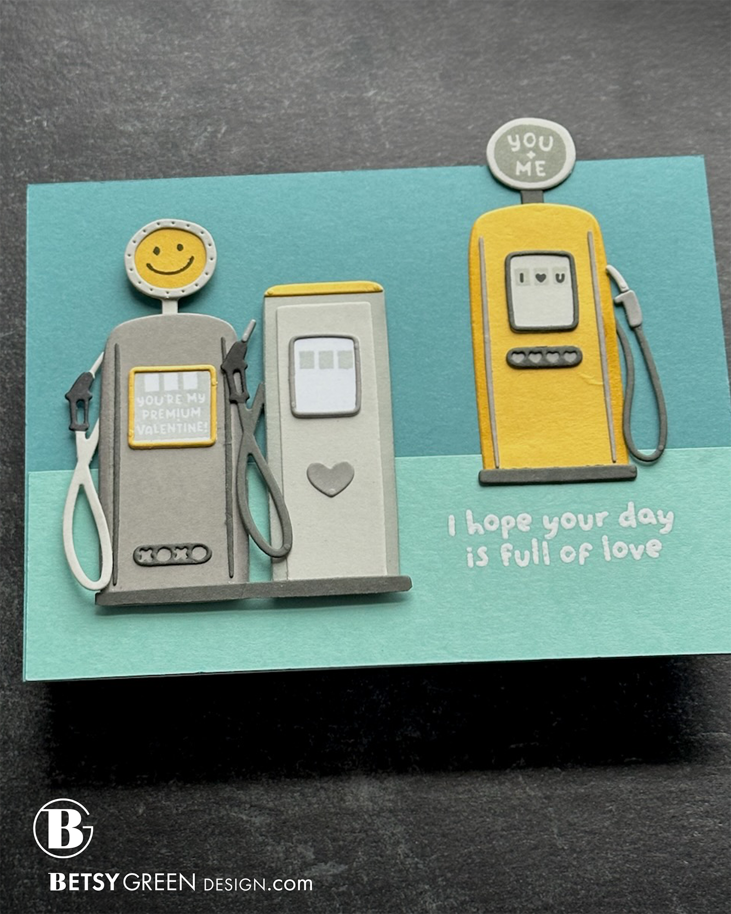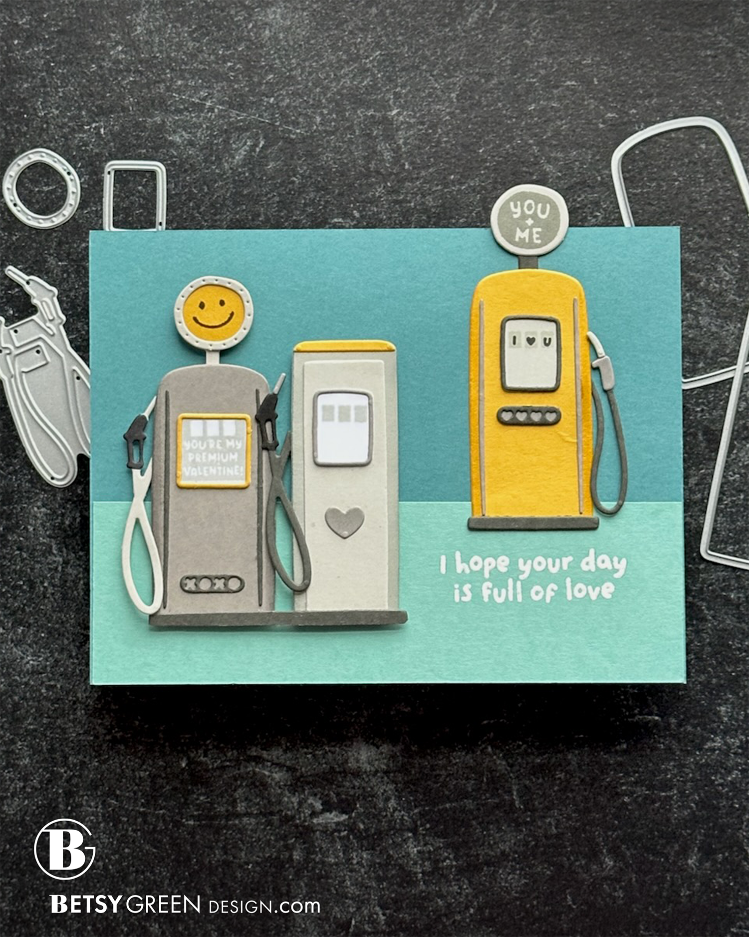 Sometimes, seeing products simply near each other gives me ideas. The words from the Stitch of Love Piercing dies made me think of billboards and other tall signs you see along the interstate or on a road trip. So, combining those with a fuel pump created that scene.