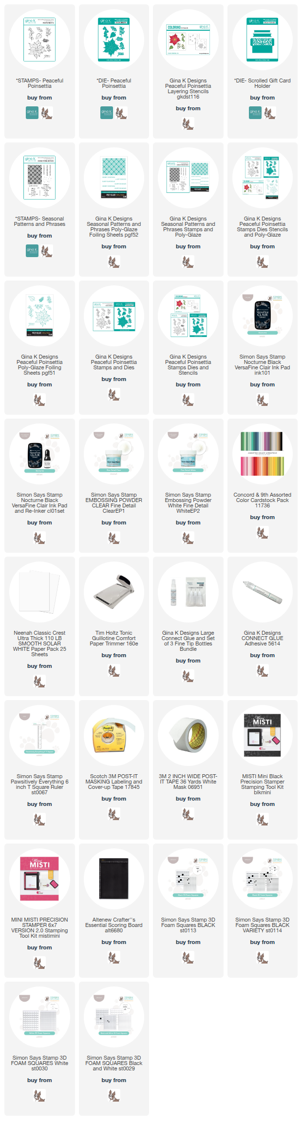 These cards feature some products from Gina’s October 2025 release, and focus on the Peaceful Poinsettia series that’s part of the release. (If you were part of the Scrapbook & Cards Today Crop & Create Delivered Cardmaking Fall 2025 virtual event, you were lucky and got all these products in that kit.)