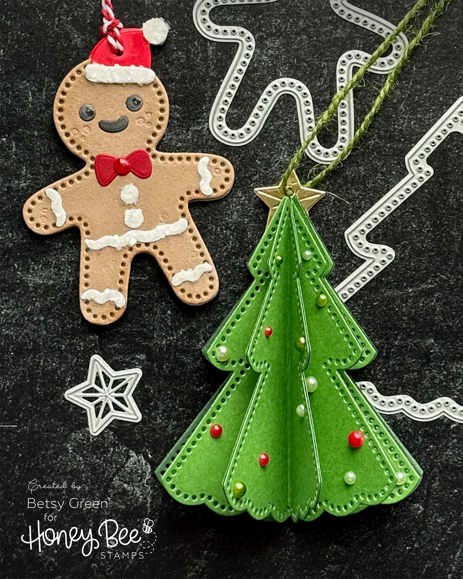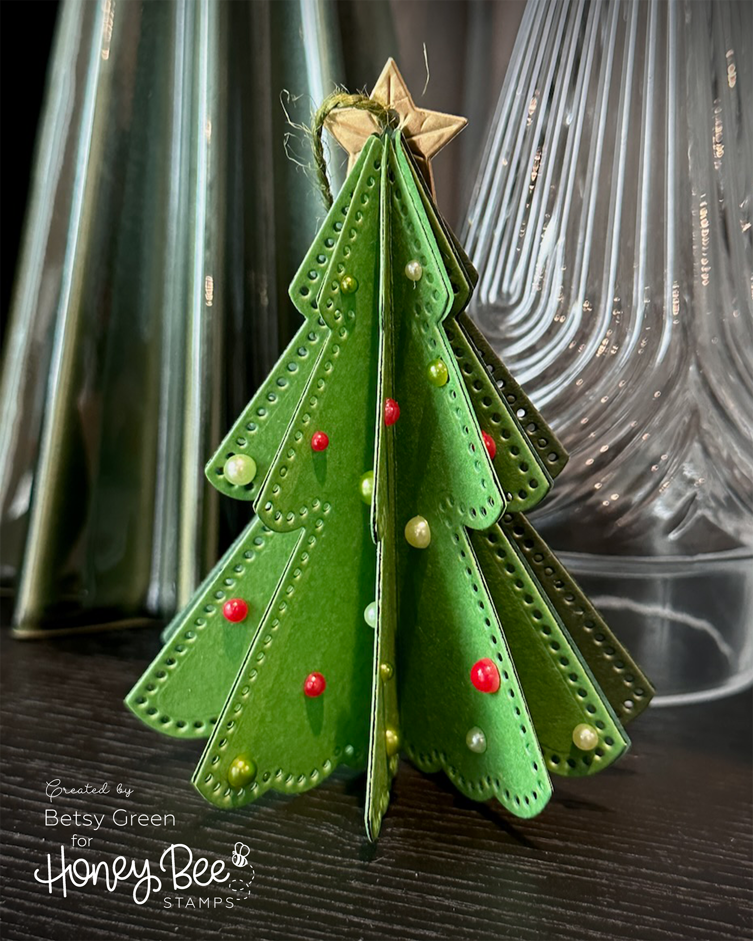 I realized I needed a way to anchor a string to tie the tag on, so I used the star die that comes in the die set, and cut that twice from metallic gold cardstock. I glued those back to back, and then punched a hole just above the center of the star. (That gave me space to glue it to the top of the back flat layer of the tree.)