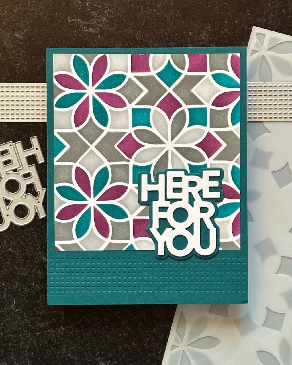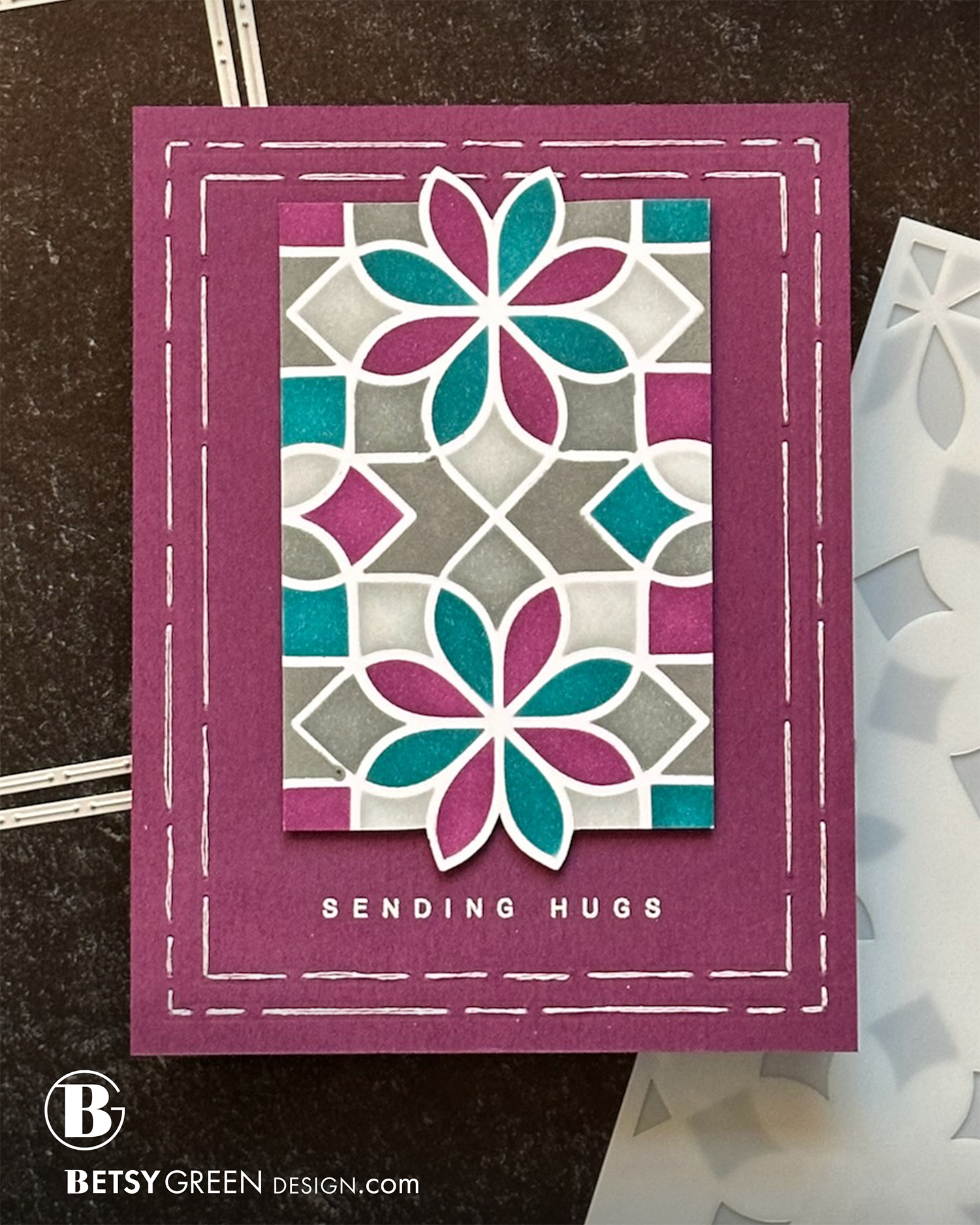 For the greeting, I stamped and embossed one of the small greetings from the Everything Will Be Okay stamp set. Doing that in white ties it in to the frame of the stenciled art, and the stitched pattern. (I actually did this after die cutting the frames, but before stitching them.)