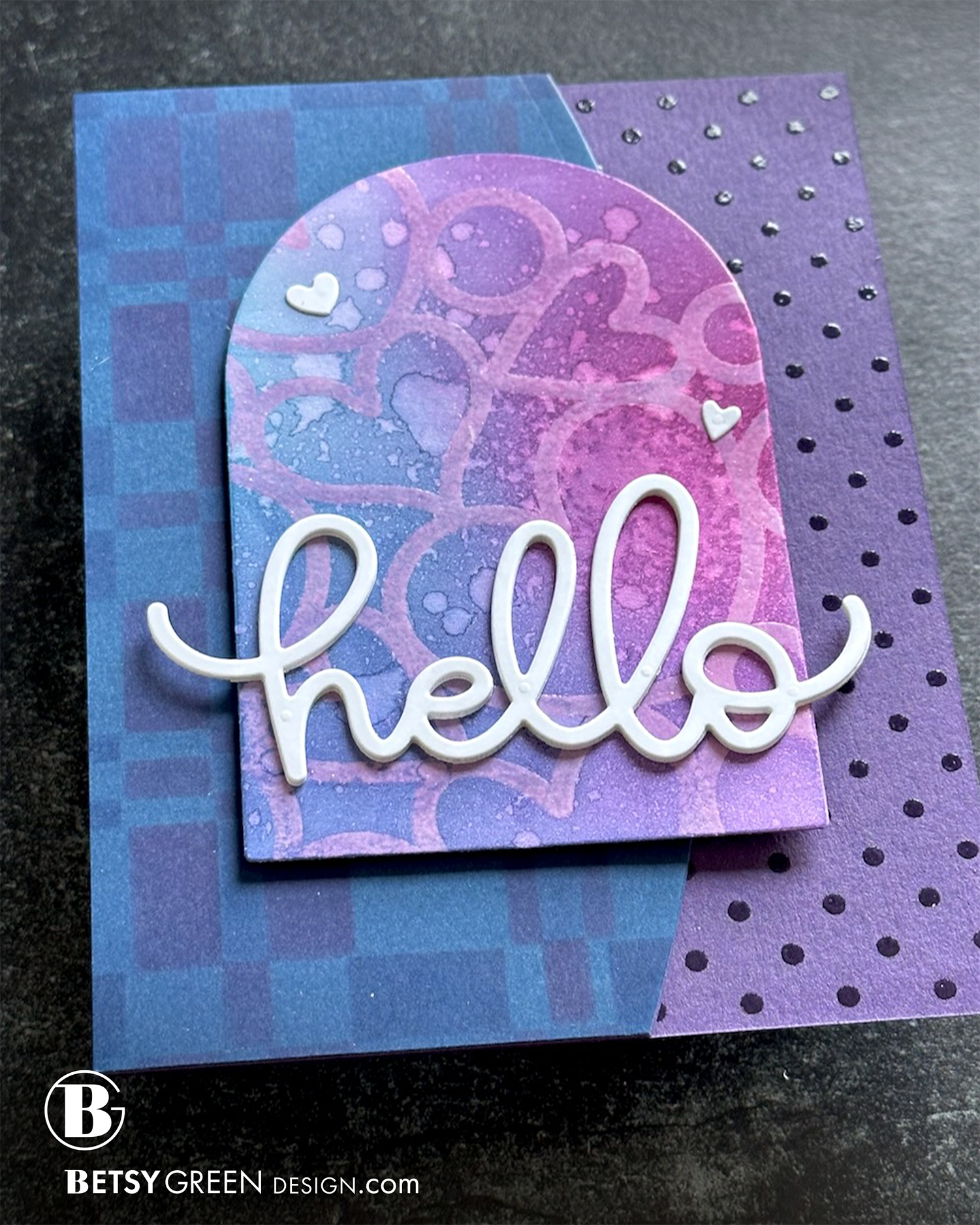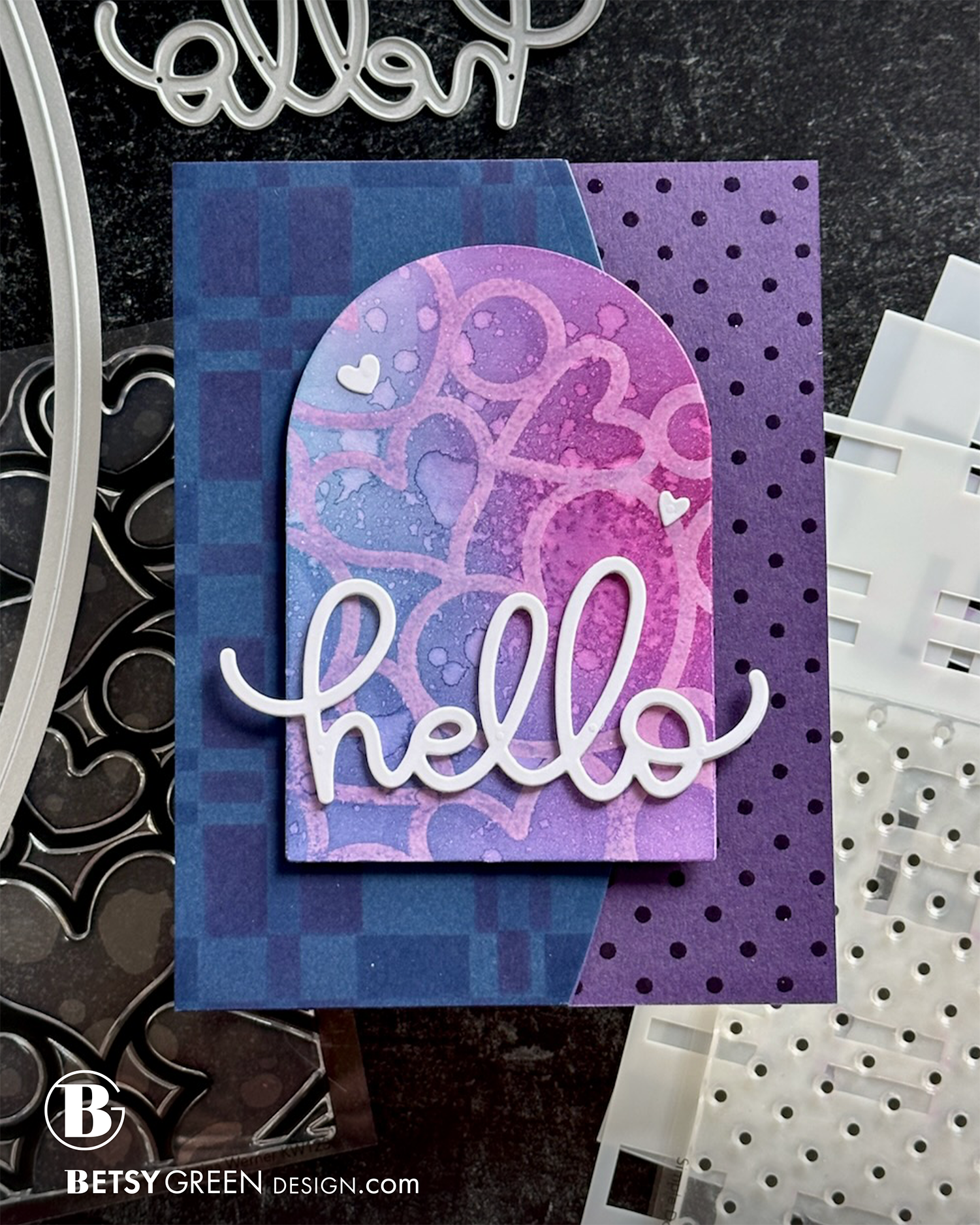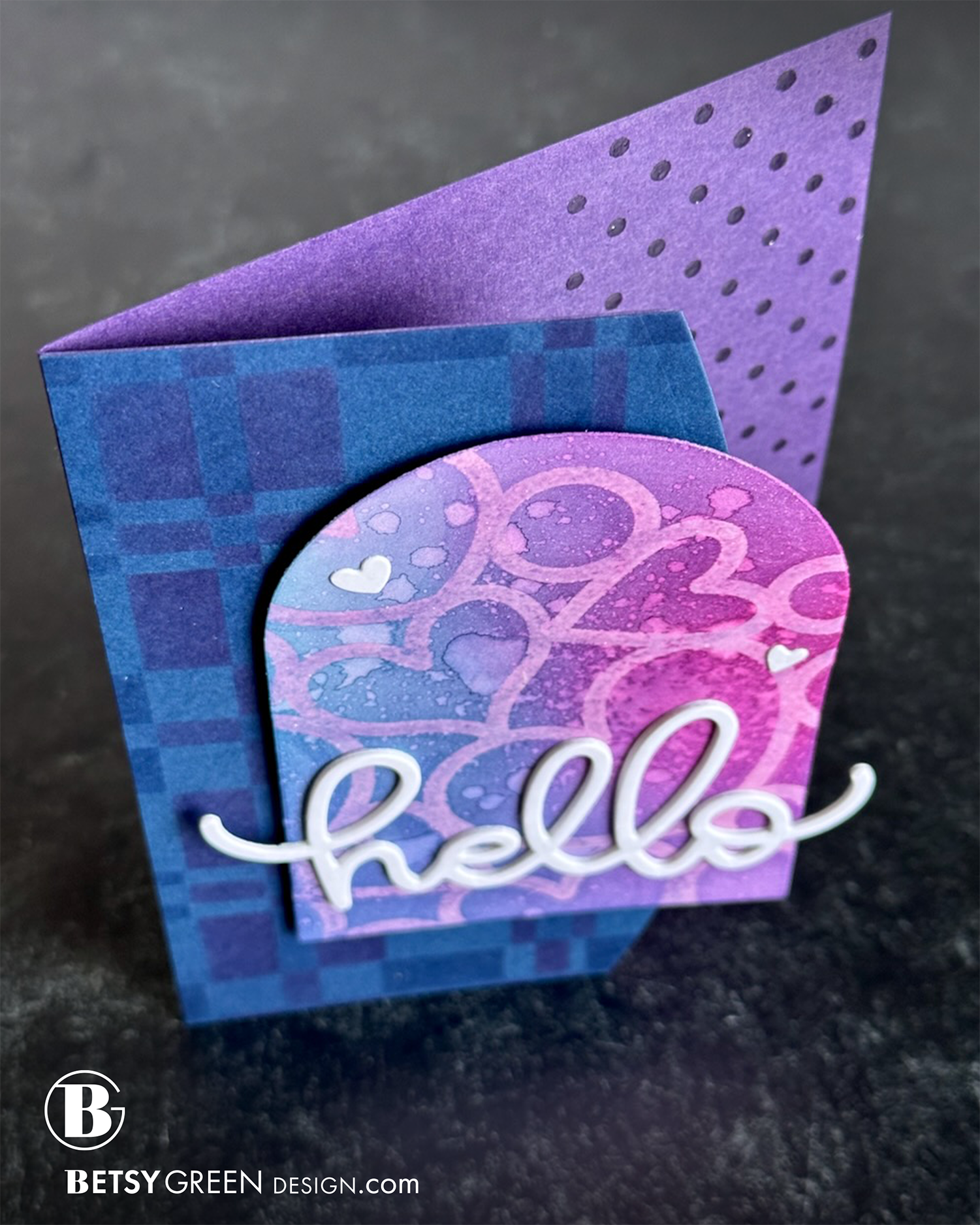I gave it a kind of offset gatefold base, with a curved edge—and more patterns. The plaid stenciling is very subtle with purple and blue inks on Midnight cardstock. I cut the edge using the Essentials Dies (see supplies below) and added the arched panel with foam adhesive.