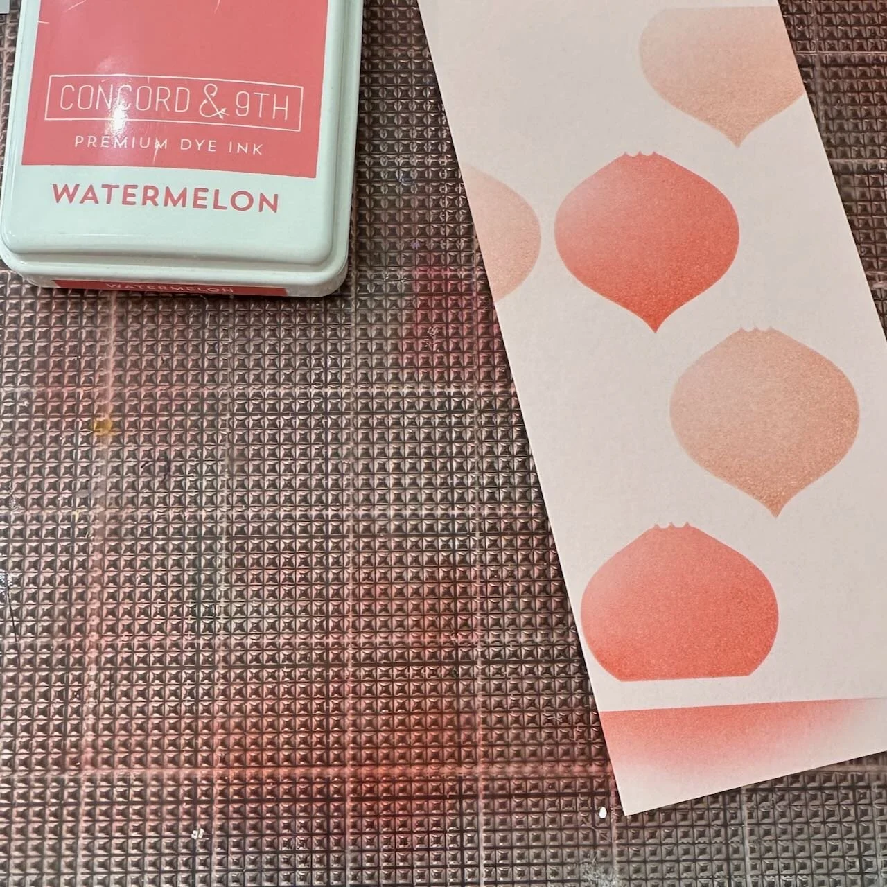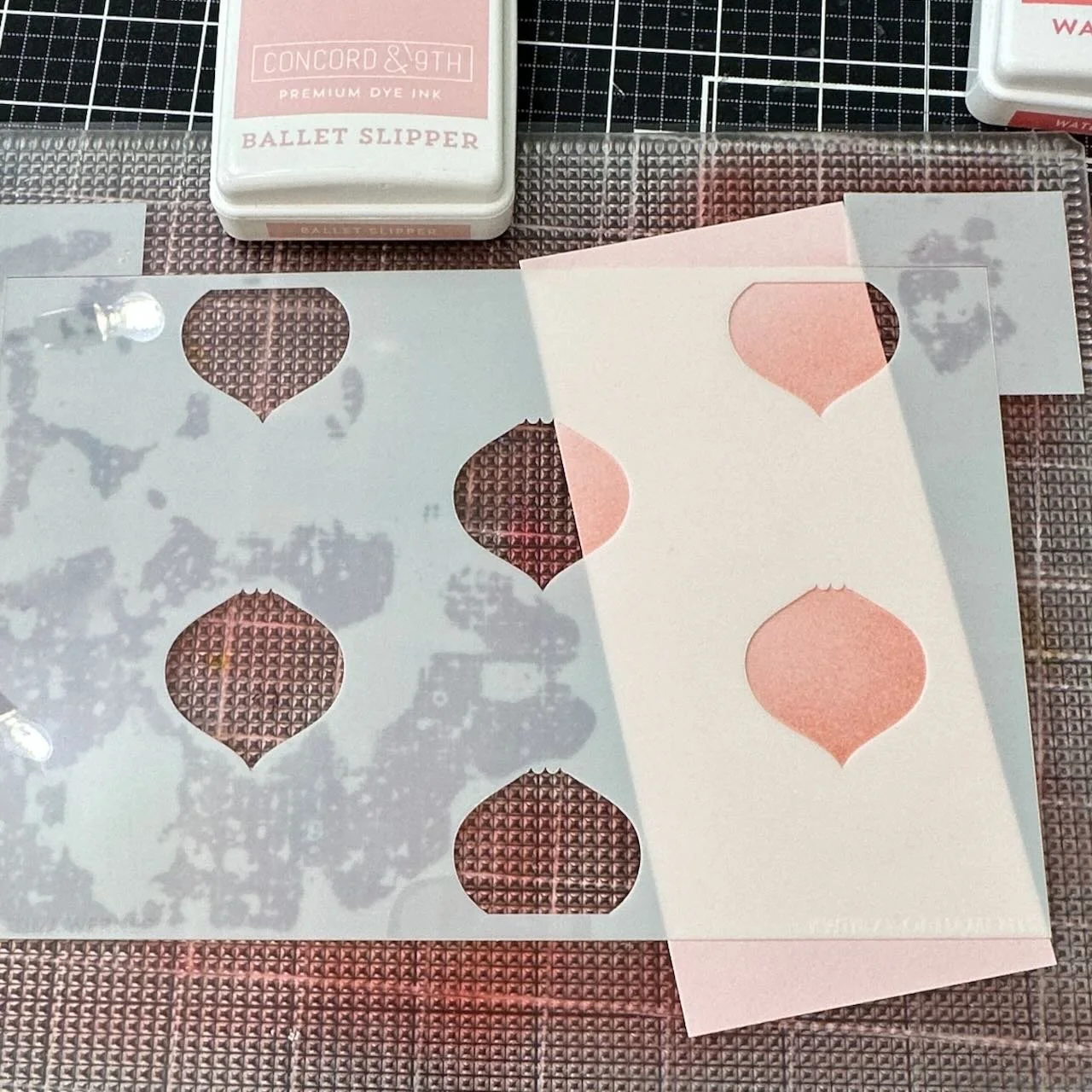 This time, I used the full stencil area, but placed on top of two different colored card panels. (One Ballet Slipper for this card, one white for card 3.) I stenciled both panels with the same four colors for the ornament pattern, and then separated them for the next steps.