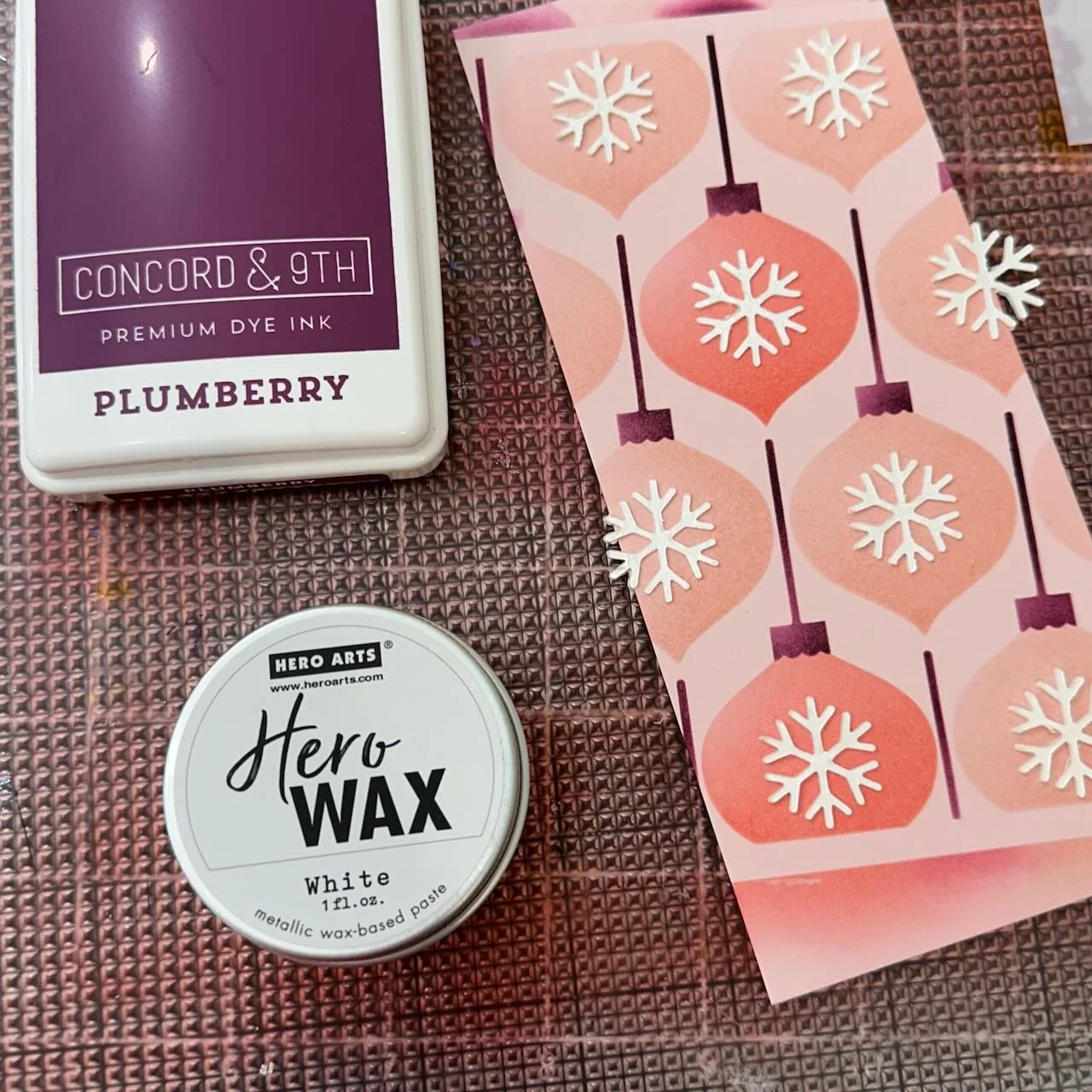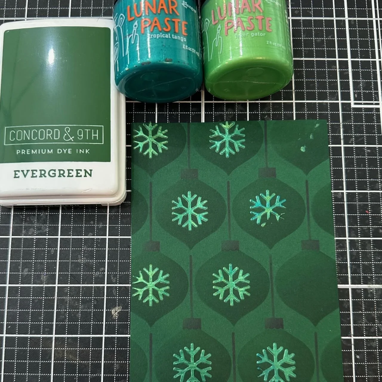 For this one, I ink blended the ornament hanger layer with silver metallic ink, and then used the same White Hero Paste for the snowflakes. (Always do the paste layer last if you can, because the thickness will mean that any following stencils won’t lay as flat and the lines won’t be as clean.)