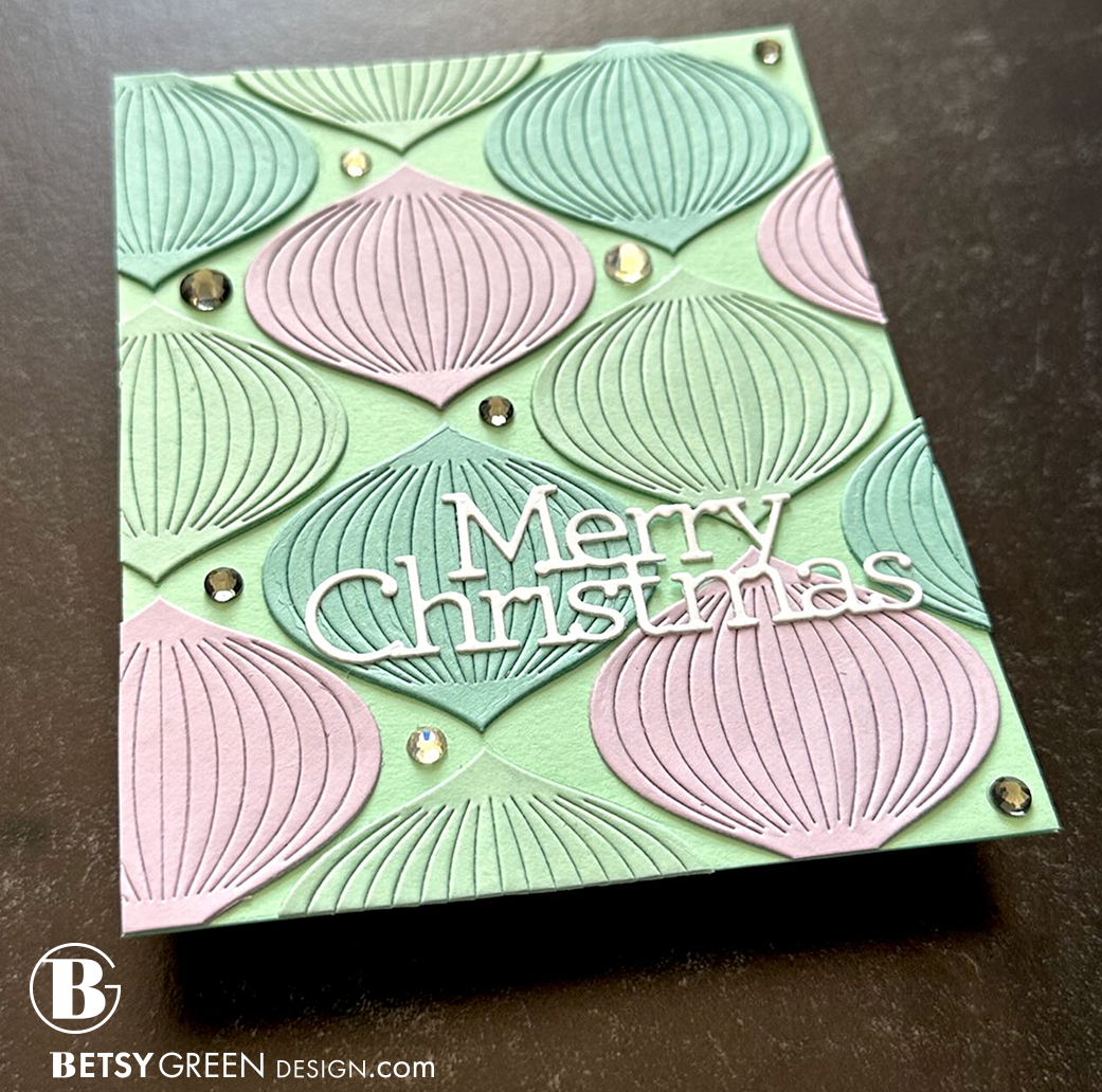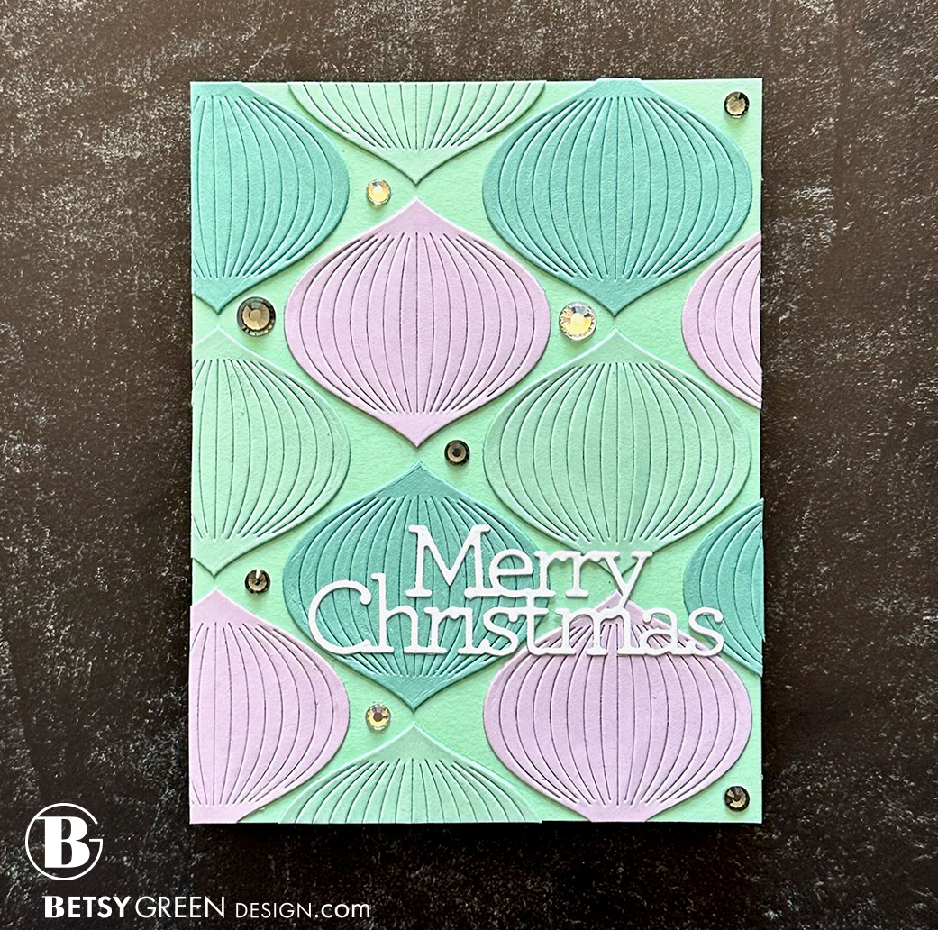 I played on this by adding thick foam squares under the centers of the ornaments, and gluing down the right and left sides.By using a patterned iridescent silver cardstock, the fun effect of this curve and dimension, combined with the texture from those die cut details, really elevate it.