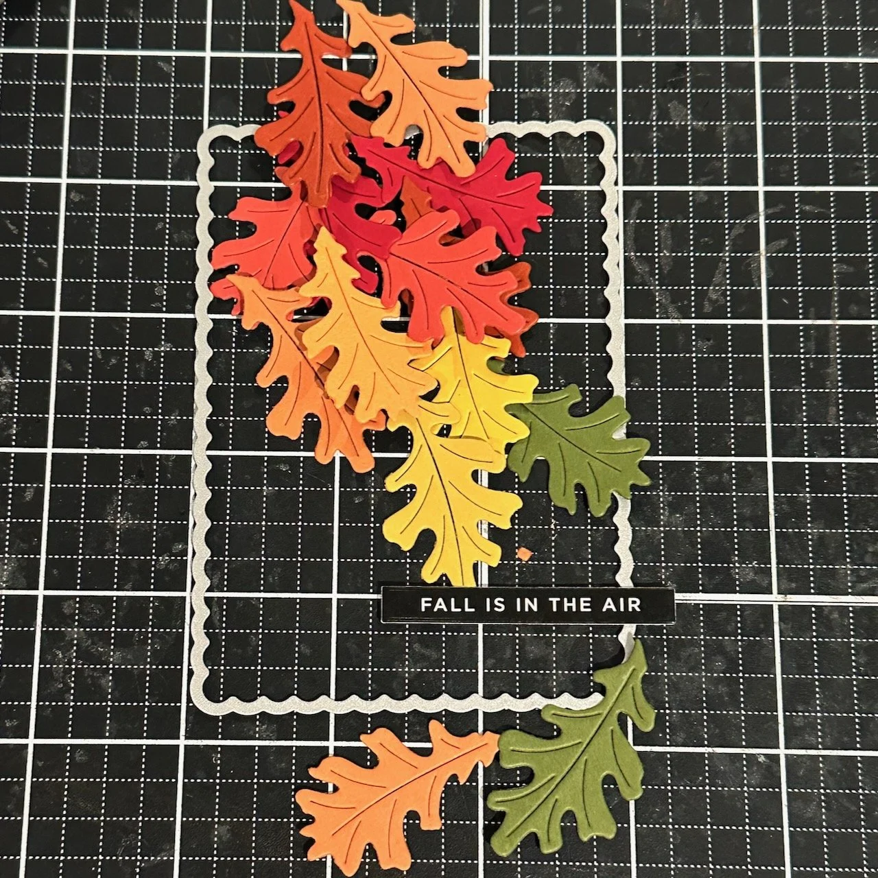 I wanted to mix these oak leaves from the Acorn Bundle die with a shaker card, so I pulled some scraps of cardstock in fall leaf colors and die cut a lot of leaves so I had options.