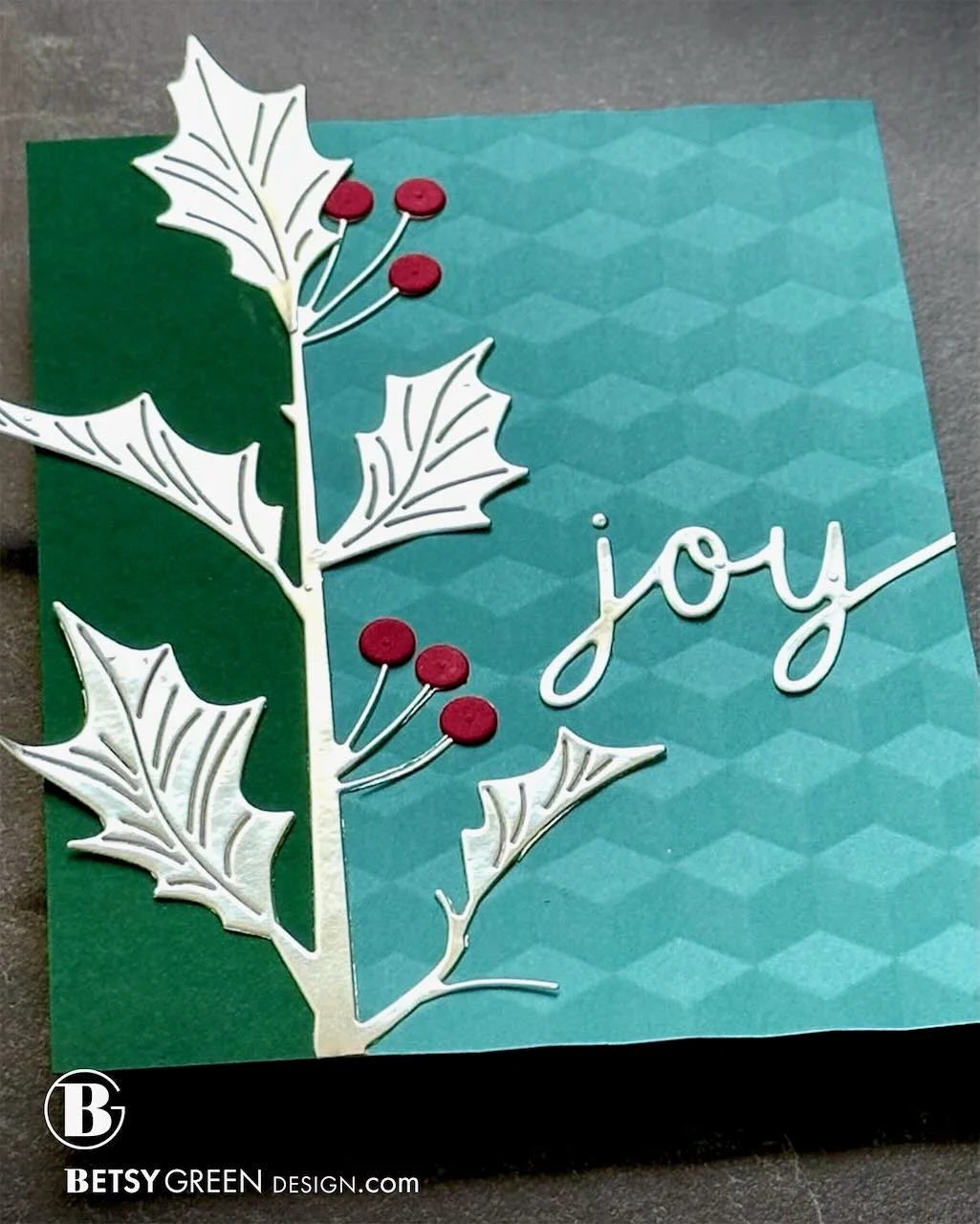 To tie in a greeting, I cut the inner “joy” die from the Holiday Duo dies from the same metallic silver as the holly. (There’s also a shadow die for the word in the set.)